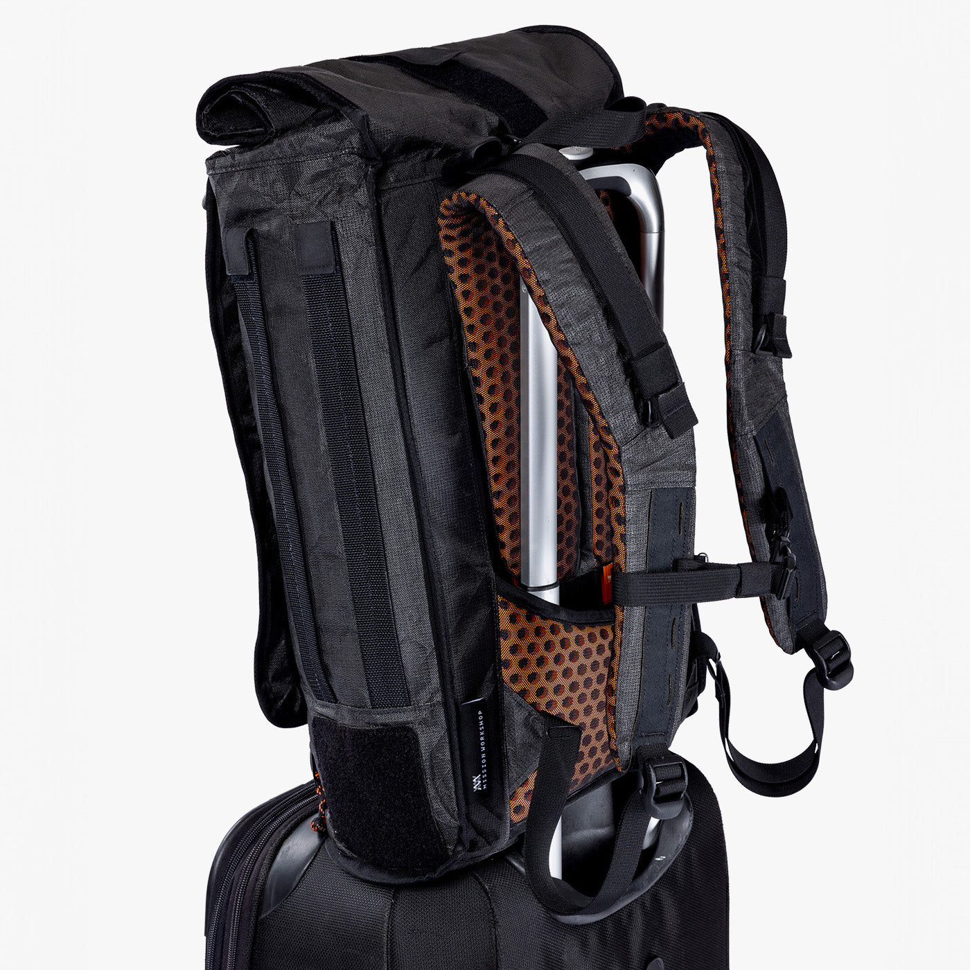 Lannerangan pehmuste luo raskaan matkatavarakahvan läpiviennin, jonka ansiosta reppu pysyy pystysuorassa asennossa, kun se yhdistetään rullamatkatavaroihin.