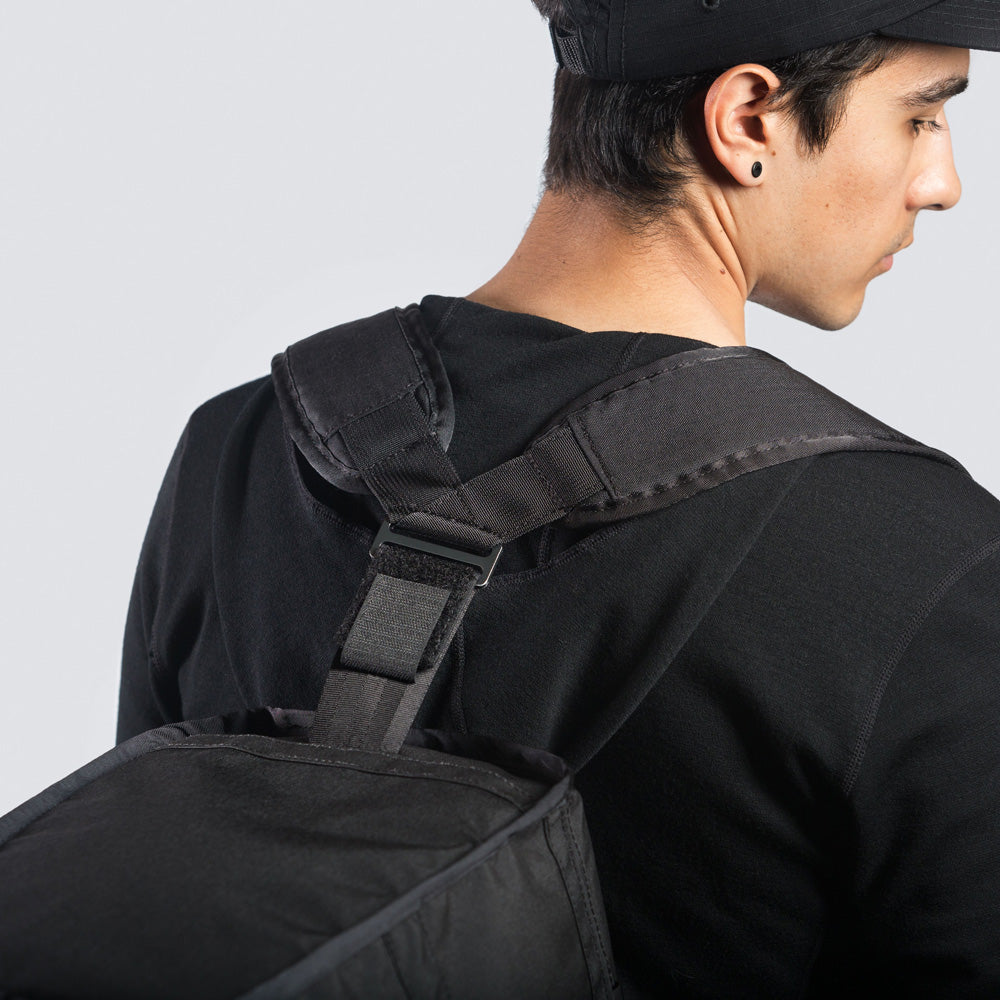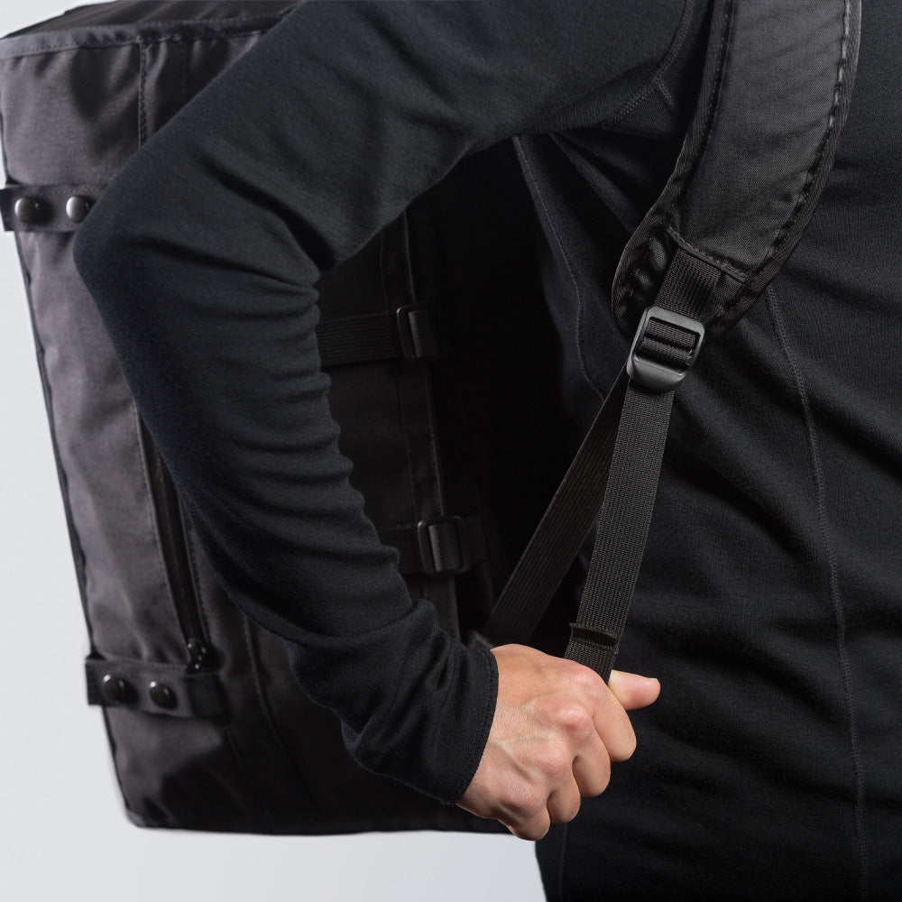 Kevyt, irrotettava reppuvaljaat duffeli laukkuun raskaamman lastin kuljettamista varten. Tämän lisävarusteena saatavan valjaan avulla duffeli voidaan muuttaa säädettäväksi repuksi.